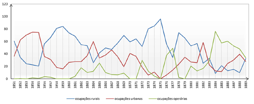 Neste demonstrativo, parece-nos que as duplas ocupações associam de modo mais evidente as complexas articulações entre o “urbano” e o “rural”. A partir de 1861, foram mesmo registrados ofícios que parecem denotar um operariado agrícola, o que é compatível com aquilo que mostra, grosso modo, o mesmo gráfico 1. Aliás, o que arrolamos, nesse sentido, também é coerente com a mencionada figura (ver o período 1861-1869 e, depois, a ponta assumida pelo traço relativo aos “operários” em 1872). Desse modo, o período seguinte, de 1876 a 1889, parece ser coerente com uma imigração parcialmente creditada ao processo de industrialização na Alemanha.