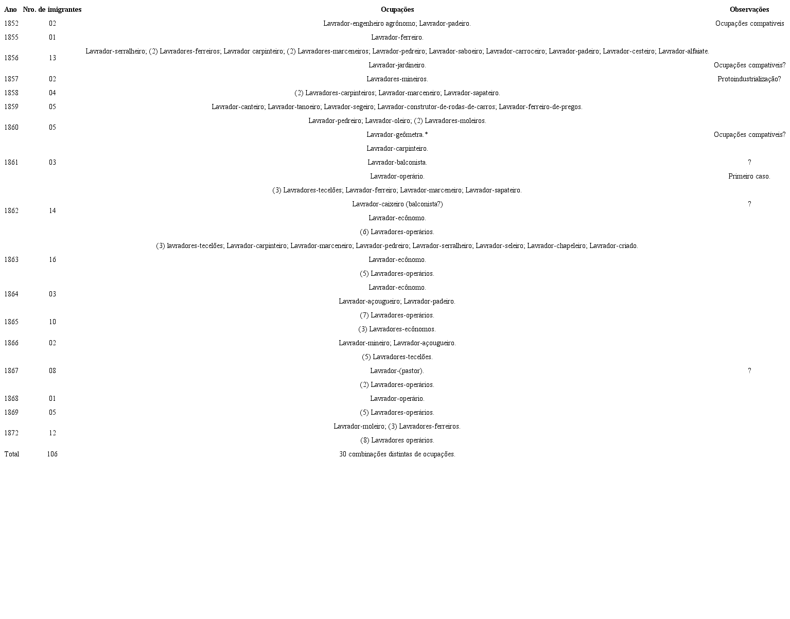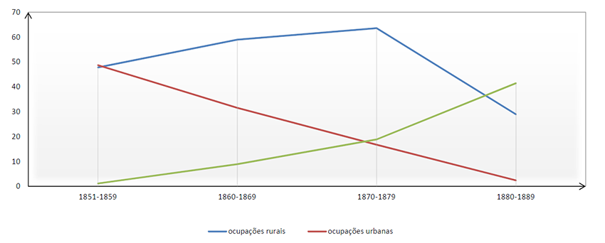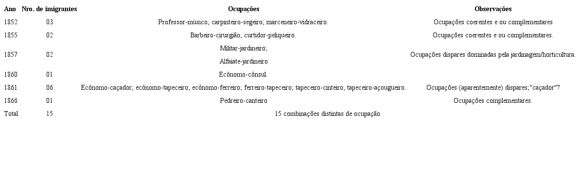 Na organização destes dois quadros, nosso intuito também era de distinguir, em primeiro lugar, as ocupações duplas de caráter, digamos, “tradicional”, que podem denotar a complexidade das atividades (e de “saberes”) de um número significativo de imigrantes que chegaram à colônia. Observe-se que esse tipo de ocupação está registrado até 1866 e, embora não se possa atinar sobre as razões que levaram a esse tipo de informação, é notável que o fato coincida relativamente com os dois primeiros períodos que assinalamos no gráfico 1.