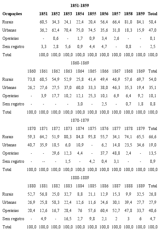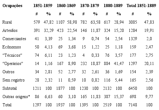 É notável como, independente das nuances possíveis - afinal, também entre eles haveria lavradores -, o número de imigrantes com essa qualidade foi significativo na primeira década (1851-1859), secundado pelos anos de 1860-1869 (média de 27% nestes 19 anos, e quase 20% durante as quatro décadas de observação - tabela 1).