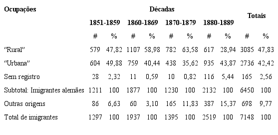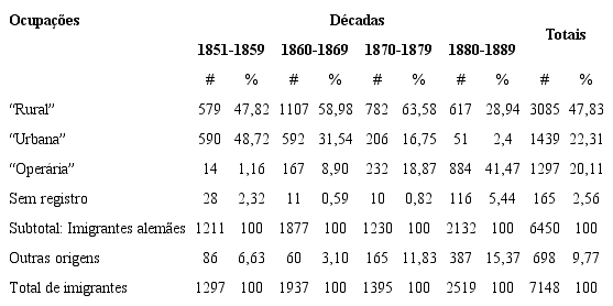 Assim sendo, é quase evidente que o imigrante categorizado como “operário” no início da década de 1850 não fosse o mesmo operário assim denominado nas listas durante a década de 1880. De modo que o fato de termos agregado as informações da fonte em ocupações urbanas, agrícolas e operárias podem incluir vieses importantes, impossíveis de discernir. Com efeito, no início da colonização, as diversas regiões que compreendiam a “Alemanha” ainda não haviam passado pelo “arranque” da industrialização - no máximo, várias áreas estariam sendo alcançadas por um processo de protoindustrialização -, e a população encontrava-se, na maioria, dispersa por regiões pouco urbanizadas, incluindo inúmeras pequenas cidades e aldeias que se achavam estreitamente ligadas ao campo.