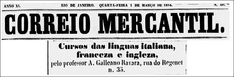 Alessandro Galleano Ravara, professor e poeta nascido em 1820 em San Pier d’Arena, Gênova, foi personagem bastante atuante no cenário de imigrantes italianos na Corte durante parte da década de 1850. Chegado ao Brasil em janeiro de 1854, já havia visitado diversos países, entre os quais Rússia, França, Inglaterra, Suíça, Turquia e Espanha, viagens que começou a interprender aos 20 anos de idade, depois de sua formação superior na Università di Genova6. Em Portugal, permaneceu por alguns anos, produziu o Album Italo-Portuguez, antologia que recolheu textos de autores italianos e portugueses, na grande maioria devidamente traduzidos, e em terras lusitanas escreveu ainda uma poesia fúnebre, em 1852, na Revista Universal Lisboense, em memória da falecida princesa D. Maria Amelia (BRANCO, 1895, p. 168). Apenas dois meses depois de sua chegada ao Brasil, já figurava em diferentes jornais brasileiros (Correio Mercatil, Jornal do Commercio, Diario do Rio de Janeiro, entre outros), anunciando seu serviço como professor de línguas estrangeiras “vivas” - italiano, francês e inglês (Figura 1).