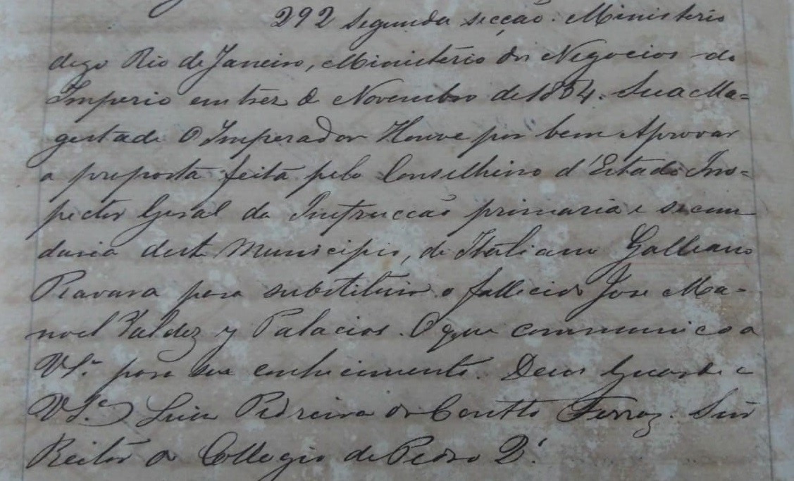 Ainda em março auxiliou o diretor a fundar o Collegio de Bemfica, onde também ministrou aulas de inglês, italiano, francês, história e geografia7; iniciou uma série de conferências no Collegio Sr. Zaluar para apresentar seu inovador método de ensino de línguas estrangeiras (baseado no Methodo Portuguez de leitura repentina de António Feliciano de Castilho); e, finalmente, no dia 2 de julho de 1854 publicou o primeiro número de L’Iride Italiana, sob os auspícios de D. Pedro II. No período de apenas seis meses, estabeleceu-se na vida intelectual e artística da Corte, recebendo inúmeros elogios na imprensa por sua erudição e dedicação à difusão das letras e das artes em geral. Ao período de Galleano Ravara no Brasil acrescenta-se, ainda, sua atuação no Imperial Collegio de Pedro Segundo: em novembro de 1854, por indicação do Conselheiro de Estado e Ministro da Instrução primária e secundária do Município, substituiu o falecido professor José Manoel Valdez y Palacios nas aulas de inglês8 para só posteriormente, em 1855, assumir a cadeira de língua italiana do colégio (Figura 2).