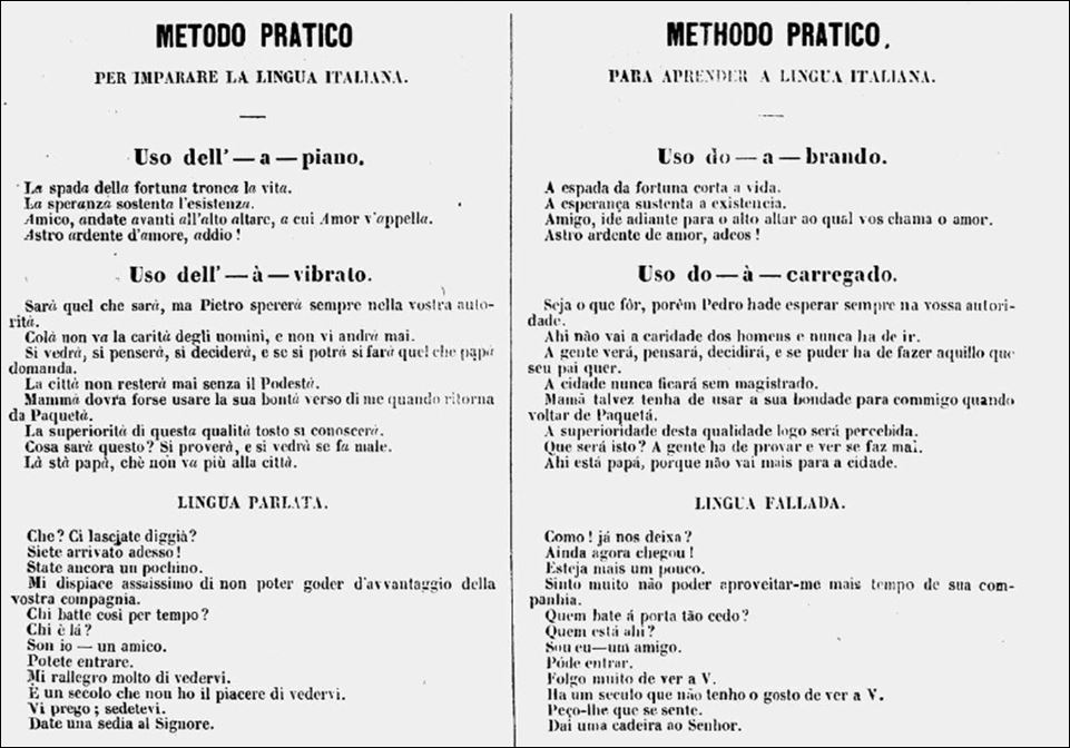 No universo tipográfico brasileiro, a maior surpresa ficou reservada ao caso italiano, cuja proliferação de jornais ganhou proporções inimagináveis, de forma correspondente à presença e à atuação de imigrantes no país. L’Iride Italiana foi precursora nesse processo em diferentes aspectos: foi o primeiro incentivo concreto da imprensa de imigração de cooperação cultural entre Brasil e Itália, com a chancela e o apoio pecuniário do Imperador do Brasil; publicou o primeiro folhetim em imprensa de língua italiana15; e, finalmente, seguiu a tendência de jornais bilíngues da época, dirigindo-se a compatriotas, mas - nota-se no seu caso - principalmente a brasileiros: a seção “Metodo Pratico per imparare la lingua Italiana” [Método prático para aprender a língua italiana] põe-se como serviço pedagógico de divulgação do método criado por Galleano Ravara, amplamente anunciado em periódicos da época, para aprendizagem da língua italiana por estrangeiros. Tal seção do jornal parece propor-se como extensão das salas de aula de Ravara, uma espécie de manual didático da língua italiana como instrumento de conhecimento da língua e da cultura da península europeia (Figura 3).