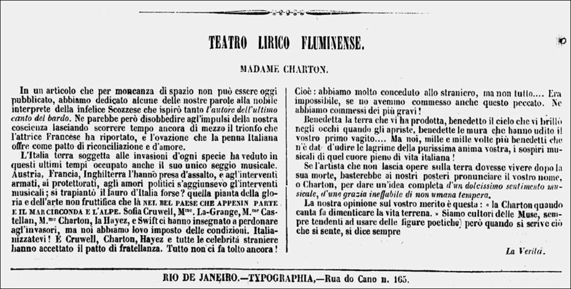 Os domínios culturais e de costumes estão bem determinados no trecho, uma vez que a cada nacionalidade são atribuídos um valor e uma autoridade. Na passagem, mesmo sem a justa e merecida relevância, apenas os italianos detinham a supremacia do canto lírico, a eles pertenciam as glórias alcançadas e deles viriam as melhores e mais adequadas críticas ao aperfeiçoamento desta arte. A erudição nas letras parece ser o fio condutor dessa idiossincrasia coletiva dos italianos no periódico, que elevava qualquer empenho nesse campo à excelência de suas produções artísticas.