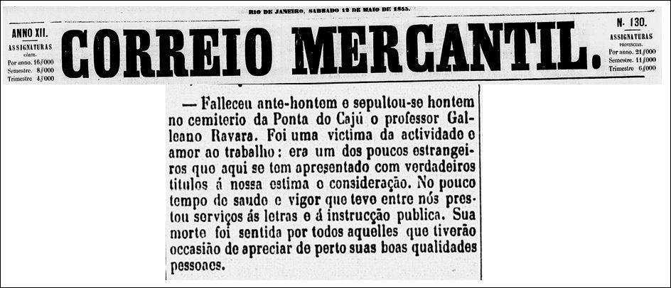 L’Iride Italiana, como dissemos, sofre breve interrupção em 1855, após o falecimento do jovem Alessandro Galleano Ravara em 8 de maio, aos 34 anos de idade. O último número do periódico do qual Ravara ainda participara data de 22 de abril, tendo retornado o jornal só um mês depois, em uma publicação dedicada exclusivamente a homenagear seu fundador recém-falecido. Sua morte prematura é publicada em 10 de maio no Correio Mercantil (Figura 5) e, posteriormente, surge também uma série de anúncios que recordam a atuação intelectual do professor italiano na Corte: