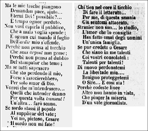 Antes da morte de Ravara, vale lembrar, a circulação de L’Iride Italiana já havia sido suspensa: o número 12, publicado em 17 de setembro, fora o último do ano de 1854 e o jornal só retornaria no ano seguinte, em 14 de janeiro. Embora a justificativa oficial para tal suspensão seja desconhecida, é interessante notar que, em 20 de agosto de 1854, o número 8 de L’Iride traz um texto intitulado “Supplica d’un poeta giornalista ad un Cesare” (Figura 6), no qual, o poeta dedica aqueles versos à “Persona Augusta”, a fim de realizar “as esperanças de um cavalheiro que não possui outra mania senão propagar a sua língua pelo mundo”. O adjetivo “augusta” referia-se claramente ao Imperador do Brasil, a quem aquela poesia foi seguramente dedicada, e o lamento e a súplica contidos nela tornavam-se cada vez mais aflitos e persuasivos ao longo da composição poética, como mostram os trechos abaixo: