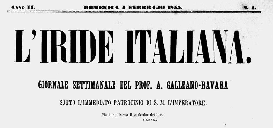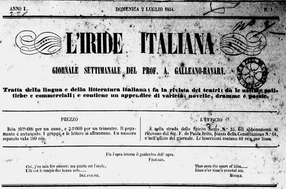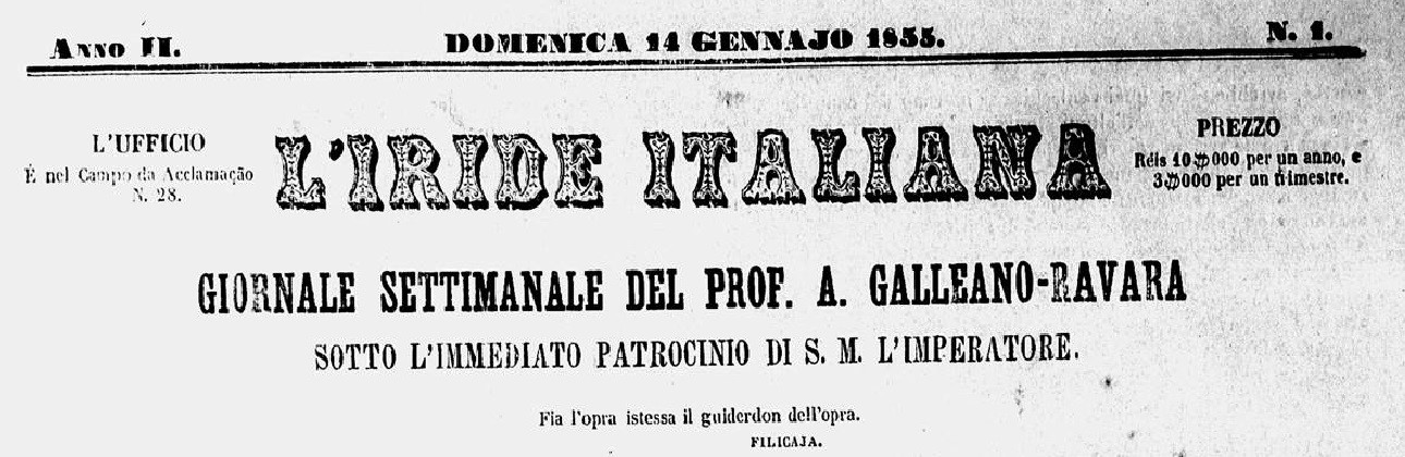 L’Iride Italiana, revista artistica, scientifica e letteraria, debaixo do immediato patrocínio de S. M. o Imperador, redigida em duas línguas pelas mais conhecidas capacidades do império, e dirigida pelo professor A. Galeano-Ravara. Subscreve-se em Pernambuco, na livraria n. 6 e 8 da praça da Independencia.