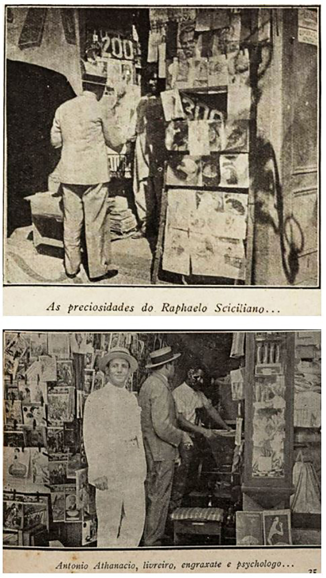 Quase trinta anos depois, a difusão da imprensa estrangeira no Brasil parecia ser generalizada: “Qualquer revista, nacional ou estrangeira, qualquer livro dos assuntos em voga, ali tem, fatalmente, um exemplar” (Revista O Malho, Rio de Janeiro, 31/03/1928). É assim que um repórterda Revista O Malho, publicada no Rio de Janeiro em 1928, se referia à banca que o engraxate Raphaelo Sciciliano montou para vender livros, jornais e revistas à clientela na reportagem “A biblioteca das ruas”. Nela, se via uma série de imagens sobre os engraxates “doublés de livreiros”, segundo o repórter autonomeado “Investigador Fonseca”. Sua matéria revelava estabelecimentos curiosos espalhados pelas regiões afastadas do trecho mais nobre do centro da cidade onde tradicionais livrarias como Garnier, Casa Victor entre outras estavam instaladas, algumas delas desde meados do século XIX. Os engraxates-livreiros se espalhavam pela rua Uruguaiana ou Visconde de Rio Branco em bancas em que se poderia ver a profusão de periódicos pendurados (Figuras 01 e 02).