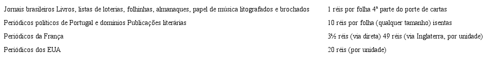 O Almanaque registra que havia tarifas privilegiadas para os periódicos franceses. Os valores dos “Portes de cartas e mais papéis” eram os apresentados na tabela 01: