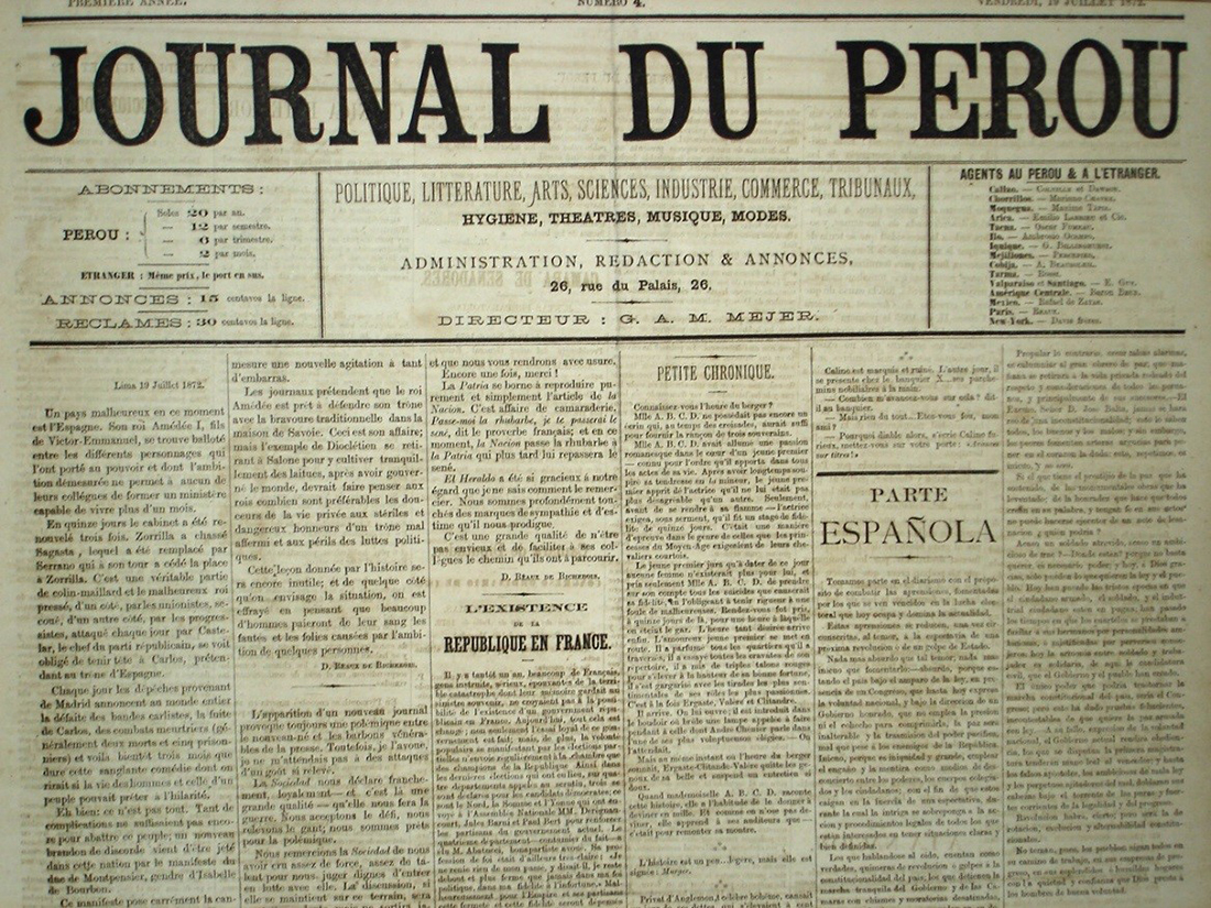 Consacrer un article aux origines de la presse francophone au Pérou peut paraître une gageure, dans la mesure où la présence française dans ce pays n’a jamais été numériquement très importante et, par conséquent, n’offrait pas un terrain particulièrement propice à l’éclosion d’une presse périodique destinée à un public francophone. Néanmoins les sources, pour éparses et lacunaires qu’elles soient, permettent de révéler l’existence d’une poignée de titres ayant vu le jour dans la seconde moitié du XIXe siècle. Comment expliquer l’émergence de ces journaux ? Étaient-ils une illustration de la volonté d’une partie des résidents français du Pérou de s’affirmer en tant que communauté à part entière ? Répondaient-ils à des objectifs politiques particuliers ? On évoquera dans un premier temps l’évolution du contexte migratoire français au Pérou et l’apparition fugace d’un premier journal, avant de décrire l’apogée de la presse francophone sur place, puis son déclin à la fin du siècle.