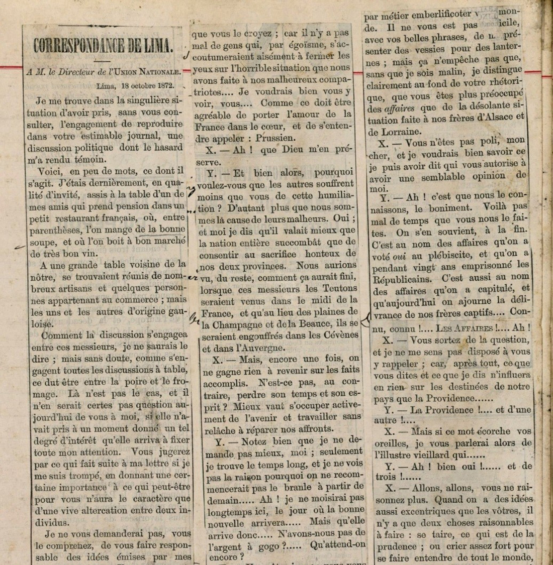 Dès ses premières années péruviennes, Ber semble avoir donné quelques articles à publier dans les journaux de la capitale, puis en 1868 il complétait son salaire d’enseignant en travaillant comme pigiste au quotidien péruvien El Nacional : il traduisait des nouvelles reçues de l’étranger et écrivait de petites chroniques locales. En 1870, en apprenant la défaite de la France face à la Prusse, il crut possible l’avènement de la république en France et décida sur un coup de tête de rentrer en France. Il séjourna dans plusieurs villes de France puis, après quelques mois d’observation de la situation, pénétra en avril 1871 dans un Paris insurrectionnel. Il proposa ses services à Charles Delescluze (le délégué à la guerre de la Commune) et lui servit de secrétaire durant quelques semaines. Insatisfait de la tournure chaotique prise par la gestion politique du mouvement, il parvint à quitter Paris avant l’entrée des troupes versaillaises et à retourner au Pérou. Mais la rumeur de sa participation à la Commune de Paris s’était déjà répandue et il fut mis au ban de la société française de Lima. Malgré la réprobation dont il était l’objet, Ber multiplia les activités en se focalisant sur l’idée selon laquelle la reconstruction de la nation française passait par l’éducation. C’est ainsi qu’il ouvrit à Lima avec quelques compatriotes une école professionnelle pour adultes, puis il collabora à ce nouveau journal L’Union Nationale, dont l’idée aurait été lancée en juin 1871. Le premier numéro parut le 2 mars 187220. Le titre complet était L’Union Nationale. Journal franco-péruvien; il comptait quatre pages. Il est un peu hasardeux de décrire le contenu d’un journal d’après un seul exemplaire. Tout ce que l’on peut en dire c’est que l’on y trouvait des informations sur les activités de la communauté française de Lima (entre autres le règlement de la Société française de bienfaisance et celui de la compagnie française de pompiers), de nombreuses publicités pour des commerces français de la ville, et des contributions faites par des membres de la colonie, par exemple ici un article sur le typhus et la fièvre jaune par Charles Tasset, un médecin parisien installé à Lima depuis plus de trente ans. Dans l’un des volumes du manuscrit de Théodore Ber on trouve diverses coupures de journaux correspondant très certainement à ses propres contributions à ce journal: par exemple, un article écrit sous forme de fable pour évoquer la question du territoire national français face à la Prusse ; un article sur l’immigration au Pérou, et le récit d’une promenade à Ancón, une petite station balnéaire située à quelques kilomètres au nord de Lima. Voilà tout ce que l’on peut dire de cet hebdomadaire. Les souvenirs laissés par Théodore Ber nous permettent par contre d’en savoir plus sur les suites données à ce journal en 1874. Reprenons son récit: