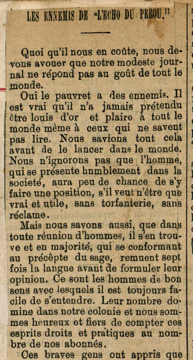 Les nombreuses adhésions que nous avons reçues et que nous recevons chaque jour, constituent à nos yeux un fait des plus importants et de bon augure pour l’avenir de notre œuvre (…). Il y a cinq ans on n’aurait pas trouvé cinquante abonnements pour le plus parfait des journaux ; les hommes les plus influents de la colonie n’auraient pu en aucun cas réunir deux cents hommes, deux cents adhésions à la meilleure des entreprises. Aujourd’hui c’est différent. Le souvenir de nos désastres ; le désir de les réparer nous rapprochent, et il suffit que les plus petits d’entre nous signalent la nécessité d’un journal français à Lima pour qu’aussitôt on leur réponde : nous sommes là ! En avant !.