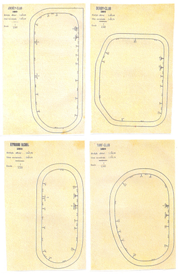 Há poucas evidências materiais de sua existência. Um dos primeiros livros de memória do turfe fluminense, escrito por Eduardo Pacheco, em 1893, apresentou os desenhos das pistas de quatro hipódromos (Figura 1), mas não a do Prado Guarany. Até este momento, de fato, não conseguimos nenhuma referência imagética de seu formato4.