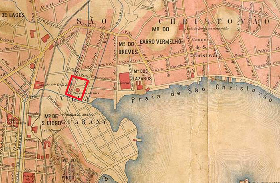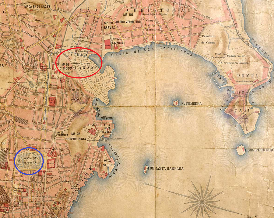 A Vila Guarany deixou poucos registros na cartografia. Somente encontramos referência ao bairro em dois mapas consultados: um do início dos anos 1900 (Figura 12) e outro de 1910 (Figura 13), esse último já com o novo porto e o Canal do Mangue construídos. Em vermelho, vê-se a identificação da região. Em azul, para fins de localização, observa-se o Campo de Santana.