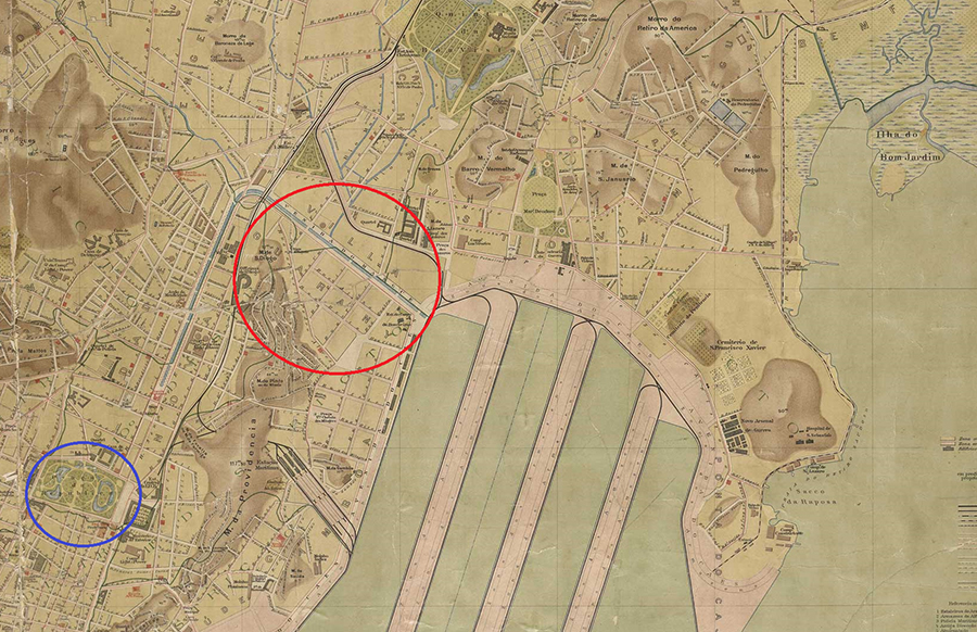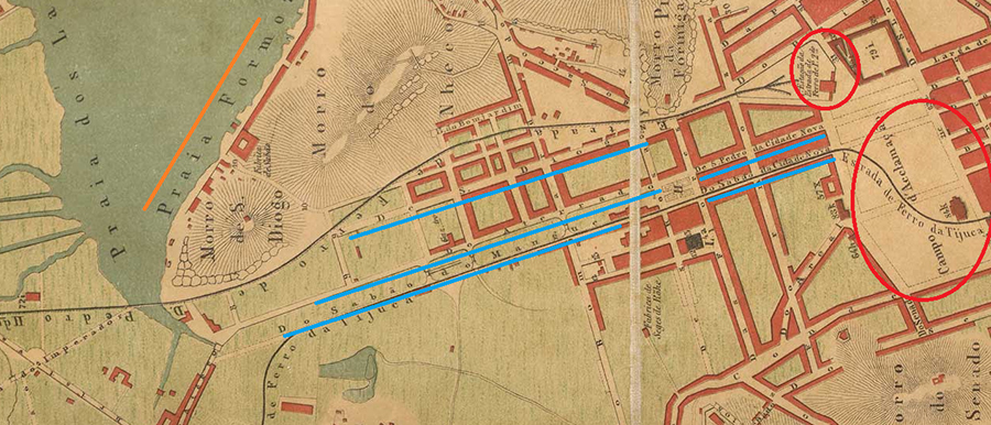 Na imagem a seguir (Figura 7), podemos ver a referência aos aterros no nome dos logradouros marcados em azul (Rua de São Diogo, Rua do Aterrado, Rua do Mangue, Rua de Pedro da Cidade Nova e Rua do Sabão da Cidade Nova)10. Para facilitar a localização, os círculos em vermelho identificam a Estação Central da Estrada de Ferro Pedro II e o Campo de Santana. A linha laranja indica a Praia Formosa.