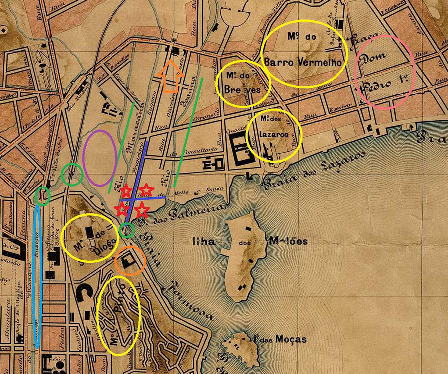 Vejamos as identificações. Em lilás, trata-se da área onde havia o Matadouro. Em azul escuro, as ruas Mello e Souza e Francisco Eugênio. Em amarelo, os cinco morros das redondezas. Em rosa, o atual Campo de São Cristóvão (na ocasião Praça Pedro I). As linhas verdes demarcam os rios Joana e Maracanã. O círculo laranja é a Estação Praia Formosa. Em azul claro, o Canal do Mangue. A seta laranja marca a direção da Quinta da Boavista. Os círculos verdes marcam a antiga Ponte dos Marinheiros, a passagem férrea e a ligação da Praia Formosa com a Francisco Eugênio.