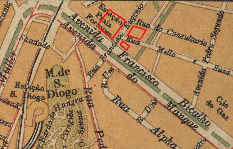 Em mapas de 191026, 191327 e da década de 1920, permanece a imprecisão. Vamos apresentar apenas o último (Figura 18), no qual se exibe um cenário bem próximo do atual, em que já está construída a Estação Leopoldina (identificada como Estação Praia Formosa). Os possíveis locais do Prado estão marcados em vermelho.
