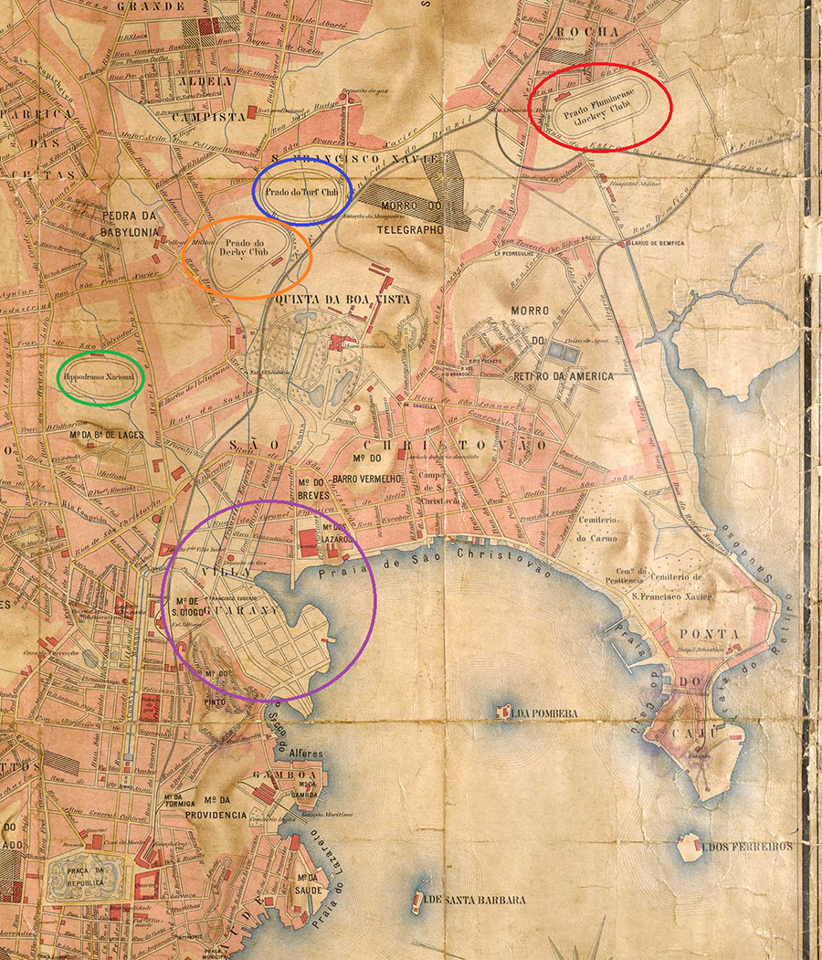 Também os mapas da cidade (Figura 2) registraram somente a existência de quatro prados. Em vermelho, está marcado o do Jockey Club, onde hoje se encontra o conjunto habitacional Bairro Carioca, antes a Cidade Light, bem próximo ao Hospital Central do Exército. Em azul, vê-se o hipódromo do Turf Club; atualmente há no local a Universidade do Estado do Rio de Janeiro. Em laranja, o prado do Derby Club, exatamente onde está construído o Maracanã. Em verde, o Hipódromo Nacional; hodiernamente, uma parte é ocupada pela Praça Afonso Pena. Em lilás, identifica-se a área onde poderia se encontrar o Prado Guarany. Os periódicos faziam referência à Praia Formosa e Vila Guarany, mas não definiam sua localização exata.