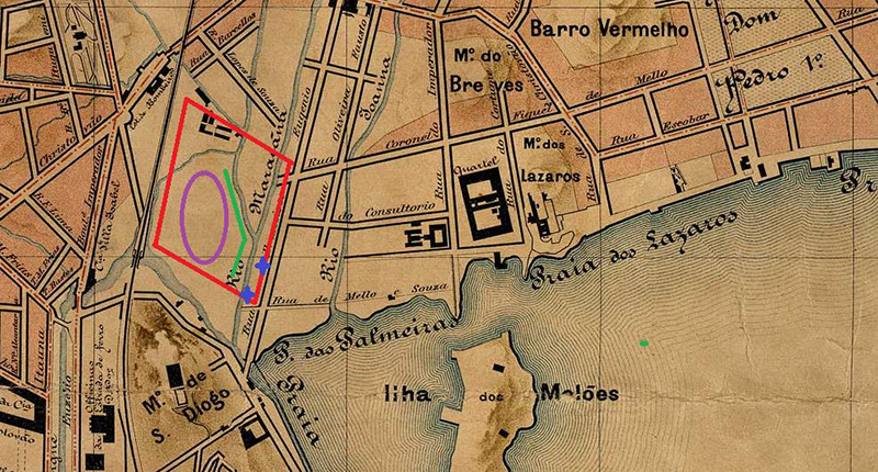 As linhas vermelhas demarcam uma possível delimitação do espaço do Prado, tendo em conta as medidas apresentadas nos periódicos e o que conseguimos verificar nos trabalhos de campo. Sugerimos em azul as possíveis entradas do hipódromo. Em verde, identificamos possíveis locais das arquibancadas. Em lilás, o possível espaço da pista e do lago central. Perceba-se, então, que o hipódromo teria sido instalado na grande área vazia onde havia o Matadouro.