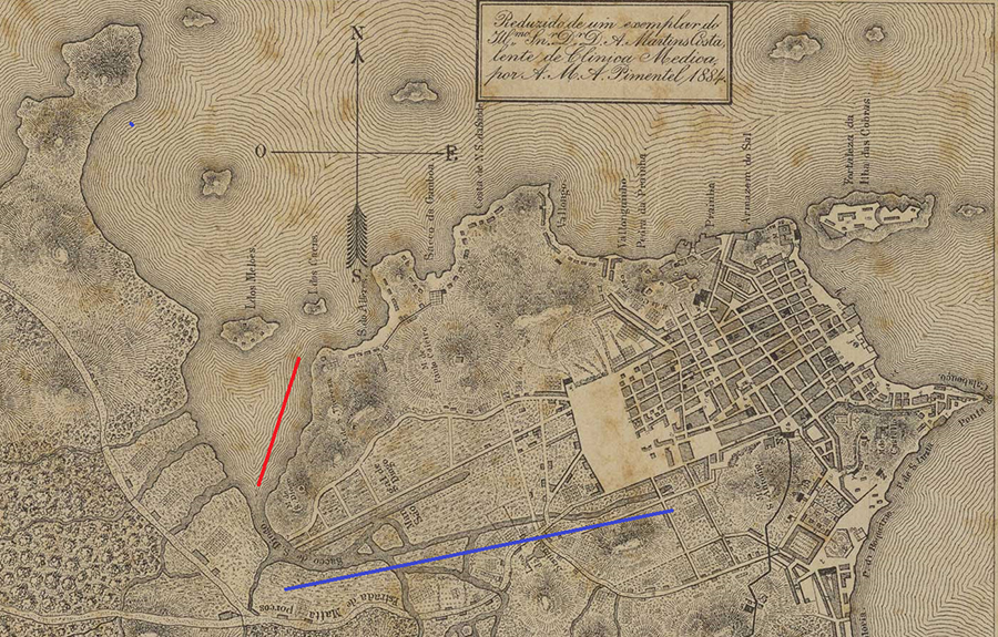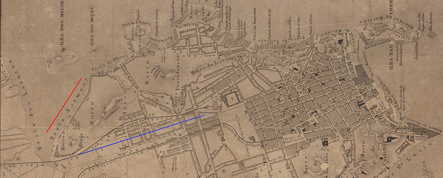 O processo de aterro fica claro ao se comparar mapas de 1808 (Figura 5) e 1864 (Figura 6). No primeiro, se percebe a Praia Formosa (não denominada, marcada em vermelho) integrando o Saco de São Diogo que avança em direção ao Campo de Santana (em azul). No segundo, o antigo braço de mar já estava mais aterrado e a Praia Formosa melhor delineada no encontro com a Praia dos Lázaros, futuramente também chamada de Praia das Palmeiras.