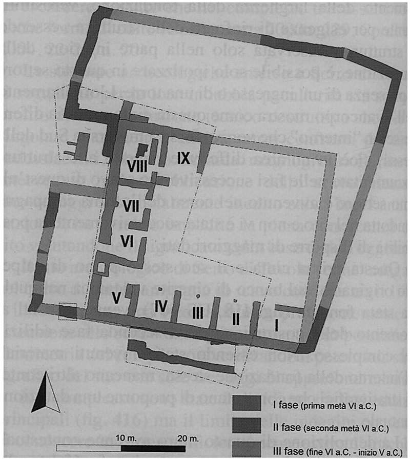 These sites date back to the second half of the 4th century B.C. and, apparently, they were built by the Lucanians to protect themselves from the passage of the armies of Alexander the Molossus. Therefore, in spite of the local origin of the settlement, the technique is influenced by the effects of Greek architecture (TRÉZINY, 1983). In the site only Greek ceramics dating from the 4th to the third quarter of the 5th century B.C. were found, the date after which there are no traces of occupation.