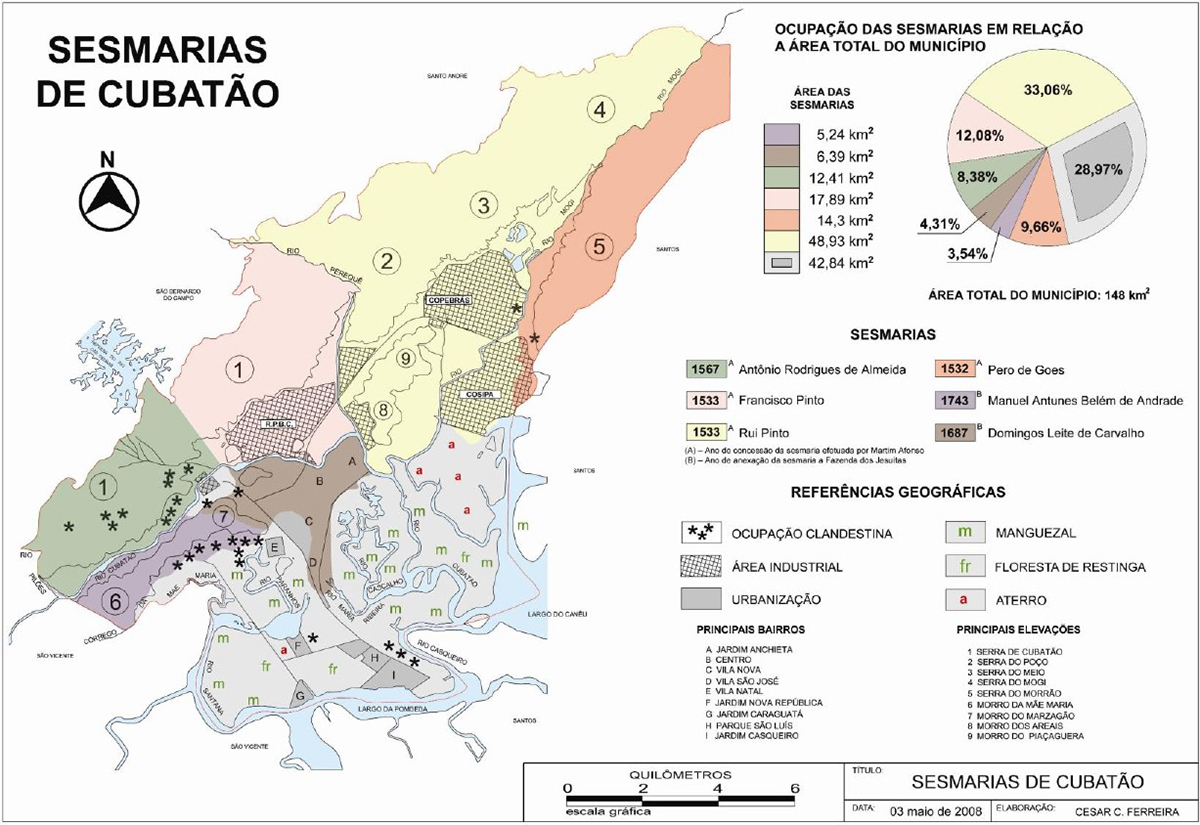 As sesmarias correspondiam a extensas áreas, sempre articuladas à área açucareira, ao porto e às vias de transporte. Francisco Torres detalhou, no caso da Fazenda Geral de Cubatão, a área ocupada pela propriedade dos Jesuítas 105,16 km2, ou 71,03 % do território. Frisamos que a propriedade jesuítica possuía uma extensão maior, conforme mapa a seguir (Figura 1), porém a ausência de limites demarcatórios impede o levantamento da área total (TORRES, 2008).