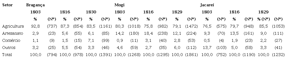 Os maços de população apresentam, entre outras características, observações que dizem respeito à ocupação ou atividade produtiva em que os chefes dos diferentes domicílios estavam envolvidos e estas refletem, como não poderia ser diferente, a essência agropecuária das economias de Bragança, Mogi das Cruzes (com a freguesia de Santa Isabel) e Jacareí (com a freguesia de Paraibuna). De fato, os maços de população de 1803, 1816 e 1829/30 evidenciam para as localidades consideradas grande contingente populacional ligado ao setor agricultura, como pode ser observado na Tabela 1.