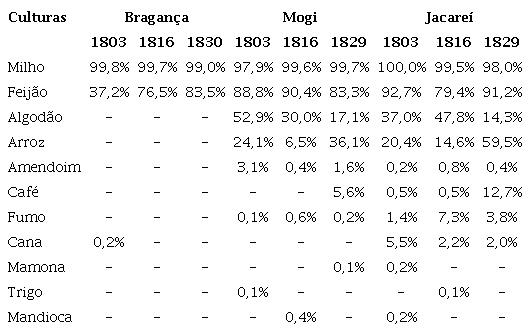 Observamos a manutenção de uma estrutura econômica de base rural fincada na agricultura de gêneros de subsistência, cuja característica mais marcante foi o grande espraiamento do milho, em muito unido ao feijão. Em alguns casos milho e feijão estavam associados a outros diferentes cultivos e/ou criações - em Bragança foi expressiva a conjugação milho mais feijão mais porcos e em Mogi, milho e feijão unidos ao algodão chegaram a ser traço majoritário em alguns momentos.