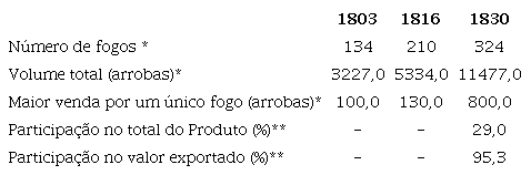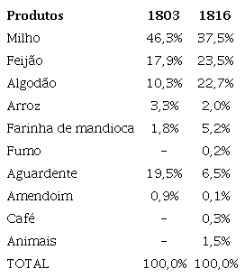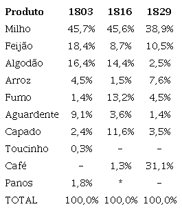 Do valor do Produto da localidade em 1816 cerca de 1,5% era devido ao café, percentual alçado a 31,1% em 1829, avançando em detrimento do milho e, principalmente, ao algodão, conforme mostra a Tabela 3. O milho teve sua participação no valor do produto local diminuída de pouco menos de 46% nos dois primeiros anos considerados para 38% no último. A sua vez, o algodão viu sua cultura declarada fortemente reduzida de 15-16% em 1803 a 2,5% em 1829, flutuação que segue o mesmo sentido da flutuação do setor artesanato mencionado anteriormente.