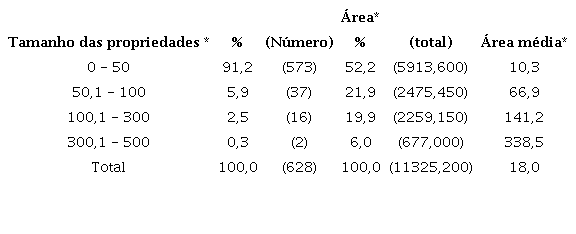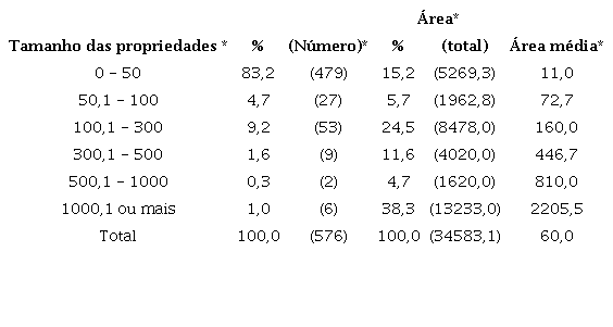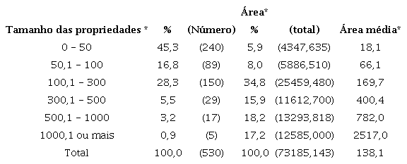 Entre as 530 propriedades arroladas em Bragança cerca de 45% correspondiam a terras de até 50 alqueires paulistas, com uma área média de 18,1 alqueires e que se apropriavam de tão somente 5,9% da área total declarada. Em contrapartida, as 5 maiores propriedades (0,9%), com áreas acima de 1000 alqueires, média de 2517 alqueires, respondiam por 17,2% das terras bragantinas, ou seja, a uma área de 12585 alqueires. Somadas àquelas as propriedades a partir de 500 alqueires, ao percentual acrescemos 18,2 pontos percentuais. Grande parte das propriedades estava nas faixas intermediárias de tamanho, que respondiam por parcela considerável de área e número, 42958,2 alqueires e 268 terras.