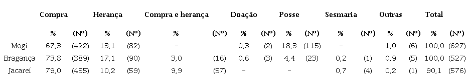 A forma de aquisição de propriedades predominante em todas as localidades foi a compra, sendo terrenos em todas as faixas de extensão comercializados em todas as três localidades e seus termos.