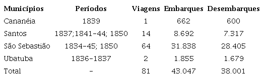 De maneira mais direta, o silêncio imposto como política de Estado ao comércio ilegal de africanos (MAMIGONIAN, 2017) e o amplo apoio social que despertava entre aqueles que dele dependiam (CARVALHO, 2012), fez ocultar personagens, espaços e estruturas do crime de reduzir homens, mulheres e muitas crianças livres ao cativeiro no Brasil. Segundo os dados compilados pelo projeto The Transatlantic Slave Trade Database - Voyages, 81 viagens negreiras foram registradas para o litoral paulista na era da clandestinidade. Entre 1836 e 1850, de Cananéia a Ubatuba, totaliza-se o envio de pouco mais de 43 mil africanos. Vejamos na tabela a seguir:
