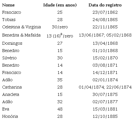 Informou ainda o vendedor que a matrícula de Honória, em 31 de agosto de 1872, quando a escrava tinha 16 anos, fora feita por sua sogra, Maria Ferreira das Dores,
