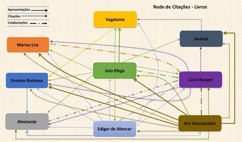 É possível identificar e eleger para efeito de análise pelo menos três elementos centrais para compreender a formação desta rede contraditoriamente espontânea e ao mesmo tempo induzida: as citações costumeiras das obras dos colegas ao longo dos textos ou na bibliografia; as colaborações na forma de ajuda documental, participação nos projetos editoriais; e, finalmente, as apresentações na forma de prefácios, introduções e orelhas. Ao tomar como referência a relação entre esses elementos, é dado passo importante para desvendar a trama construída. É possível sugerir que, embora mais tênue e delicada, a primeira delas foi desenvolvida muito informalmente por aquelas obras da década de 1930 reeditadas nos anos 1970. Animal, por exemplo, em seu livro fez verbete elogioso sobre Vagalume e agradeceu sua ajuda particular e a contribuição geral dada à música popular. Vagalume lembra e cita Orestes Barbosa logo nos agradecimentos. Orestes é o mais econômico em sua obra e cita apenas Almirante ainda na condição de cantor. Quem fechou o circuito entre esses livros bem posteriormente, dando-lhes sentido coletivo e geracional, foi Ary Vasconcelos que, já na Funarte, fez apresentação das obras, incluindo ainda a de Marisa Lira. Deste grupo mais antigo, Jota Efegê é o mais ativo na lembrança e citação dos colegas. Fez resenha elogiosa em jornal em 1933 a respeito do livro de Vagalume e nas suas crônicas lembra e relembra histórias de quase todos eles. Bem mais tarde, na bibliografia do Maxixe, a dança excomungada (1973), ele citou as obras de Edigar Alencar, Ary Vasconcelos e Mariza Lira. A presença desta estudiosa na rede é ambígua: ela pouco cita seus colegas, mas é citada por quase todos eles. Isso se explica certamente pelo fato dela ter escrito suas duas principais obras no final na década de 1930 e por sua condição de folclorista e pesquisadora reconhecida que concede certa autoridade à citação.