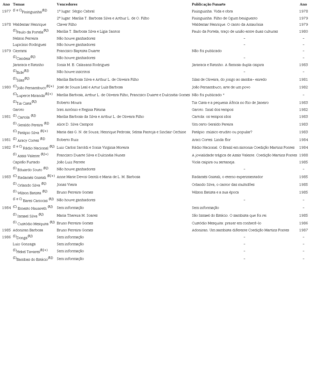 Uma bancada de examinadores era designada para cada seleção, que contou eventualmente com a participação de Lúcio Rangel, Almirante, Ary Vasconcelos e Edigar de Alencar, entre tantos outros avaliadores. A Funarte tinha verba própria destinada ao edital. Mas, entre 1981 e 1983, e novamente em 1986, teve que requerer financiamento ao Conselho Nacional de Direitos Autorais e, em 1985, à Petrobrás (D.O.U. 28/07/1986, p. 1171). A premiação era dividida em duas partes: valor em dinheiro aos indicados e a garantia de publicação das obras escolhidas. Apesar dos evidentes benefícios aos pesquisadores, reclamou-se à época do número reduzido de concorrentes em alguns concursos. Nos dois primeiros editais, houve casos da inscrição de apenas uma monografia e em duas situações não apareceu nenhum inscrito, como no concurso de Bide em 1979 (MILLARCH, 08/04/1980, p. 6.). Já nos concursos de Nelson Ferreira, em 1978, Lupicínio Rodrigues, 1978, e Candeia, 1979, a comissão de avaliação julgou os textos apresentados muito frágeis e, por isso, não concedeu premiação. Não satisfeita com o fato, a Funarte tratou de encomendar para três autores reconhecidos as biografias de Bide, Candeia e Lupicínio, indicando, respectivamente, Sérgio Cabral, Lena Frias e Luís Fernando Veríssimo. Nenhum deles, no entanto, concluiu a tarefa. A avaliação interna da instituição considerou que essas dificuldades gerais podiam ser também resultado dos editais muito rígidos, fato que provavelmente criava limitações e temores nos jovens pesquisadores. Por isso, já no terceiro edital, de 1980, a comissão tratou de flexibilizar as orientações e desmontar o possível surgimento de um conflito entre “os grandes nomes da pesquisa e a nova geração”, segundo Ary Vasconcelos. Reforçando este aspecto, Lígia Santos, filha de Donga, e vitoriosa com a biografia de Paulo da Portela, disse que quando começou a escrevê-la “era uma pessoa medrosa” e temia a reação dos antigos pesquisadores, mas, com incentivo, acabou triunfando (Jornal de Minas, 09/04/1980). Em compensação, Lígia contou nesta monografia com a parceria da jovem pesquisadora Marília Trindade Barbosa Silva que havia alcançado o segundo lugar, ao lado de seu antigo professor Arthur de Oliveira Filho no concurso sobre Pixinguinha. Essa dupla formada por professor e aluna também saiu vitoriosa nos concursos de Silas e Cartola, tornando-se assim a maior vencedora de todo projeto. Por outro lado, significava também que havia chegado a um certo modelo aceito pelas bancadas de seleção.