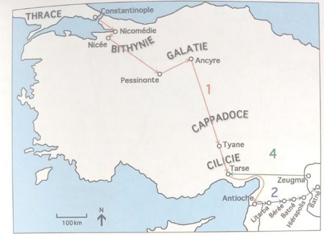 Mais uma vez, notamos uma amplificação realizada por Amiano Marcelino, o que não invalida a ocorrência desses acidentes em menor escala. O mais importante é como esses eventos foram interpretados pelo autor antioquiano e pelo próprio Juliano: os presságios foram manifestos em todos os aspectos possíveis, não só apontando a rota das batalhas, mas a rota para o óbito do Imperador. Podemos verificar no mapa abaixo, o percurso efetuado pela expedição militar, de Constantinopla até Batné.