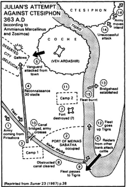 Esse incidente aniquilou a nossa frota quando não era necessário. Juliano, confiante nas forças concentradas de seu exército, invadiu o território inimigo com superioridade numérica, uma vez que suas tropas não estavam mais ocupadas com tarefas de abastecimento, graças à abundância de alimentos do território persa. Ao captar essa intenção, o inimigo incendiou as plantações, causando a fome e o impedimento do avanço das tropas romanas (AMMIEN MARCELLIN, Histoires, XXIV, 7, 6-7).