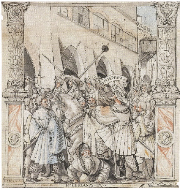 Em 1521, o pintor e ilustrador alemão Hans Holbein concluiu um pequeno desenho, em nanquim e aquarela, que serviria de molde para painéis que adornariam a prefeitura da cidade suíça de Basileia (Figura 1). A imagem, com pouco menos de 30 centímetros, trazia um homem, de coroa e uma longa barba, deitado ao chão, enquanto uma outra figura, vestida à maneira dos mercenários helvéticos Landsknechte e Reisläufer, colocava um pé sobre suas costas, e uma multidão cercava ambos (cf. ROGG, 2002). Acima do bem-vestido mercenário, voava uma bandeira com a frase Sapor, Rex Persar[um]. Abaixo da figura barbada, a frase: Valerianus, Imp[erator] (KREYTENBERG, 1970, p.78-80).