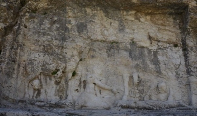 O homem coroado, de longa barba, era Valeriano, imperador romano do século III. O triunfante sujeito trajado como um mercenário, em verdade, era Sapor, o segundo xá da Pérsia sassânida, contemporâneo ao líder latino. A cena, como um todo, recriava a humilhante derrota de Valeriano para Sapor na batalha de Edessa, ocorrida em 260 EC (DODGEON; LIEU, 2005, p. 2). Este embate marcou não apenas o ocaso das forças romanas no Oriente, mas também a captura do imperador Valeriano - que se tornou o primeiro e único líder latino a ser feito refém e morrer em cativeiro (CALDWELL, 2018, p.335-336).