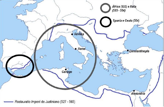 Toda a obra de Justiniano, sucessor de seu tio Justino I em 527 no trono de Constantinopla, foi de fato dominada pelo projeto da restauratio imperii, da plena reafirmação da autoridade imperial no seu contexto geográfico e político tradicional, o Mediterrâneo (...) (GASPARRI; LA ROCCA, 2013, p. 129).