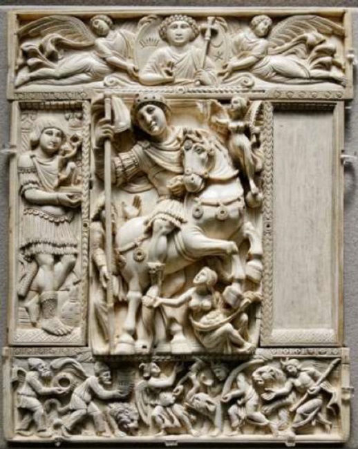 De fato, podemos imaginar a riqueza e os detalhes do manto fúnebre de Justiniano e o seu impacto junto daqueles que o viram, na medida em que o falecido imperador estava representado em seu fulgor máximo, como um conquistador vitorioso sobre todo o orbe que recebeu o apoio e o amparo divinos. Mas o que chama a nossa atenção é que a descrição oferecida por Coripo aproxima-se muito do alto relevo apresentado pelo díptico Barberini (CAMERON, 1975, p. 144) (Figura 2), peça esculpida em marfim e que faz parte do acervo do museu do Louvre na qual encontramos a figura do imperador vitorioso, possivelmente o próprio Justiniano. As “falanges de bárbaros com o pescoço curvado” aparecem na parte inferior, oferecendo os tesouros conquistados nas vitórias alcançadas por Justiniano, sempre apoiado por Deus que é representado na parte superior do díptico. No centro está o imperador, vencedor e que subjuga o bárbaro que está atrás do cavalo, certamente uma alegoria do rei vândalo Gelimer derrotado e levado em triunfo a Constantinopla no ano de 534, tendo no seu lado direito a figura de Belisario, líder da vitoriosa campanha contra os vândalos.