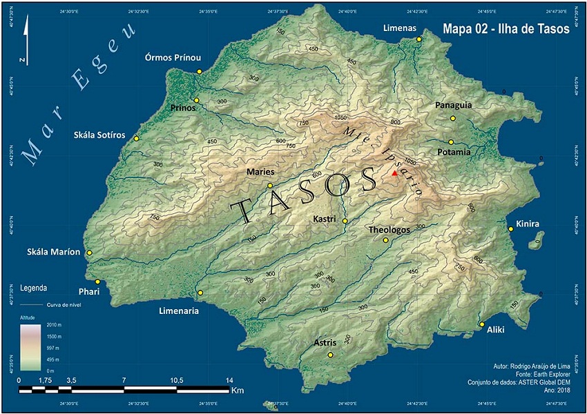 Throughout its history, the island of Thassos has offered fertile lands to its own. According to Herodotus (VI, 46, 2-3), the riches from the island provided their inhabitants with an annual income of at least 80 talents22 in the early 5th century BC. The earliest Parian settlers23 settled in Limenas, northeast of the island (Figure 2), a very propitious place, since it had a safe natural port, which was fundamental for an exit through the north - turned to the Thracian continent. Due to its proximity to the coast of Thrace, trade between the Thracians and local peoples of the island became quite intense (TIVERIOS, 2008, p. 73). Figure 1 gives an overview of the distance between the Thracian continent and the island of Thasos.