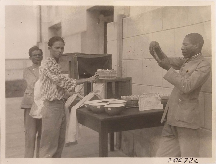 Eles trouxeram consigo 10 macacos rhesus, importantes para as experiências que seriam realizadas devido às recentes descobertas na África. Além disso, levavam consigo vários porquinhos da guiné, coelhos e ratos. Esses animais foram deixados no armazém do cais enquanto os médicos se dirigiram ao IOC-Ba para colocar o material biológico que continha o vírus em um refrigerador (BURKE, 7 jul. 1928). As imagens que seguem contribuem para a compreensão sobre como funcionaria o laboratório nos meses e anos seguintes (Figuras 1, 2, 3 e 4).