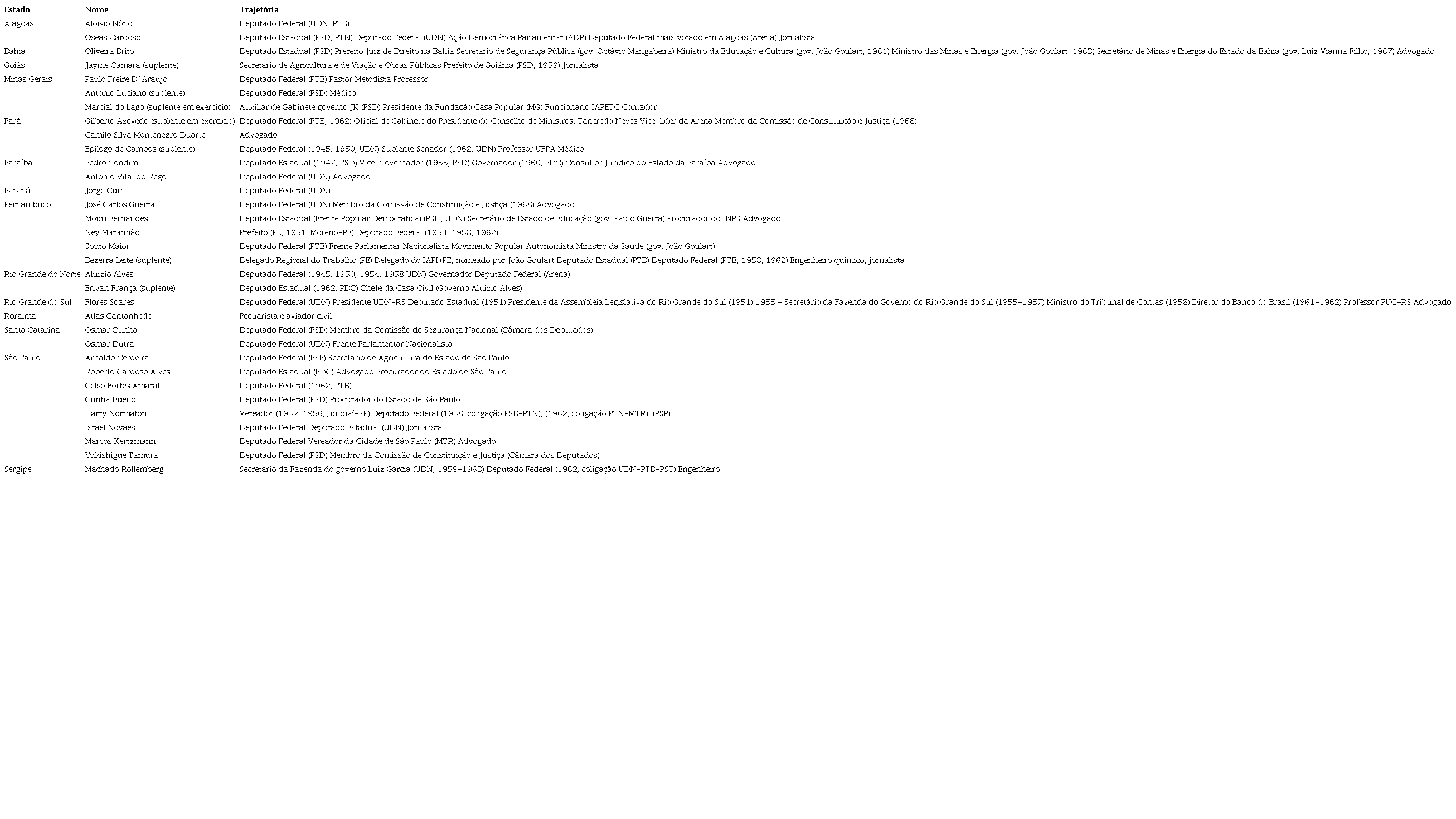 Na ocasião do Golpe de 1964 não havia propostas de modificar completamente o sistema político. Ao preservar os partidos e o Congresso Nacional, o novo regime manteve as elites políticas conservadoras ao seu lado, construindo uma continuidade nas relações de poder em Municípios e Estados por todo o território nacional. No entanto, ainda em abril de 1964, os “revolucionários” consentiram com as primeiras cassações de mandatos e suspensões de direitos políticos de parlamentares em todos os níveis, de governadores e de prefeitos. É notório que foram afastadas autoridades eleitas principalmente por partidos reformistas, como o Partido Trabalhista Brasileiro (PTB) e o Partido Socialista Brasileiro (PSB) (DOU, 1964). Em Estado e oposição no Brasil, Maria Helena Moreira Alves considera o recurso ao poder de cassação uma demonstração de que o Legislativo e os partidos políticos constituíam alvos importantes, o objetivo era intimidar o Congresso Nacional e reduzir as possibilidades de coalização parlamentar entre PTB e PSD (ALVES, 1984, p. 63)