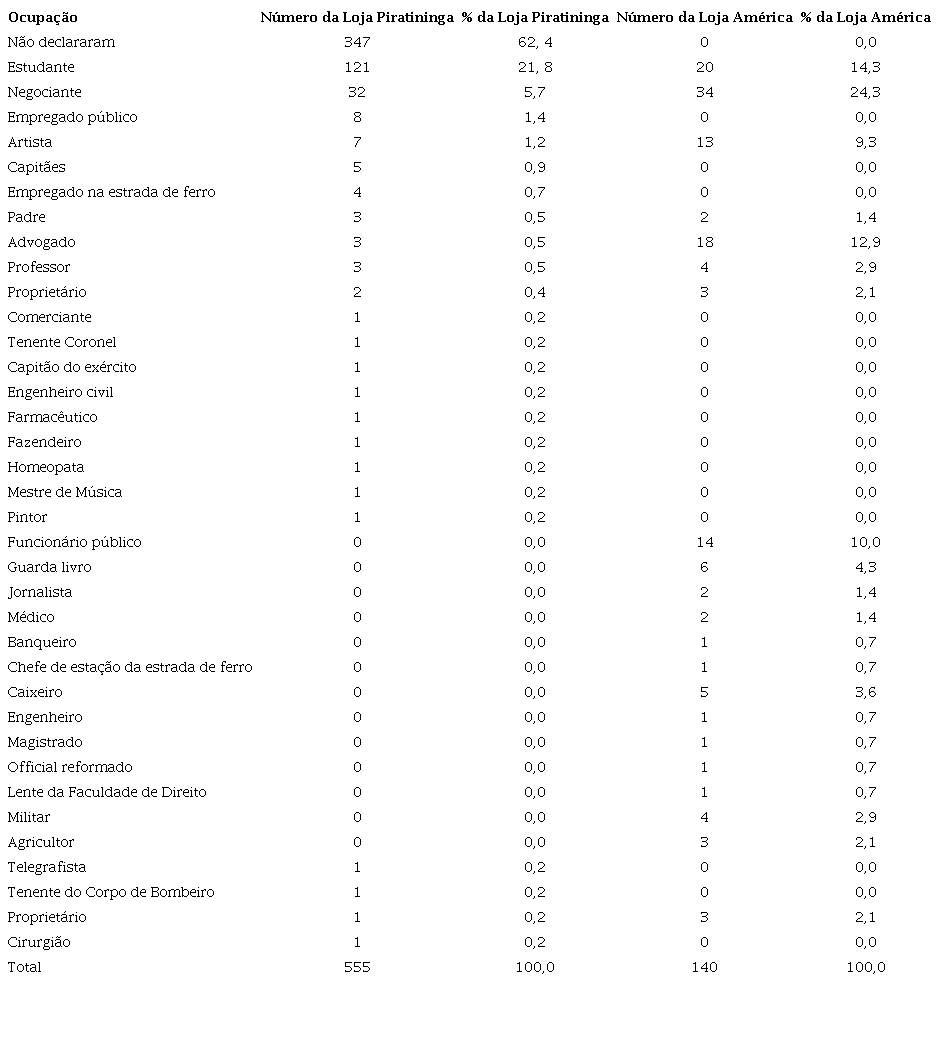Como vimos na Tabela 2, mencionada anteriormente, a Loja América sofreu menos influência da presença de estudantes do que a loja Piratininga. A América atraiu, especialmente, no primeiro período, profissionais liberais (advogados, médicos, jornalistas etc.), em geral, homens maduros e socioeconomicamente estabelecidos.