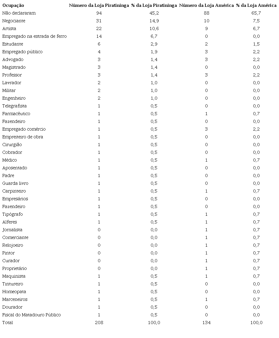 No primeiro período, a loja Piratininga iniciou 32 negociantes e, no segundo 31. Apenas sete iniciados no primeiro período se declararam artistas, ao passo que, no segundo, o número alcançou a marca de 22 membros. A quantidade de Irmãos que, em seu testemunho se declarou empregado na estrada de ferro também variou significativamente: no primeiro período, foram quatro iniciados e, no segundo, 14, como se observa na Tabelas 1 e 2.
