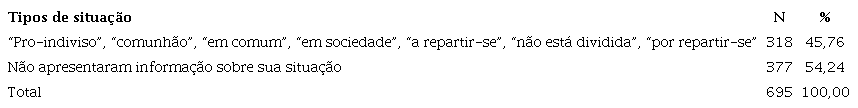 Como vemos na tabela 10, abaixo, as designações diversas tais como por “repartir-se”, “em comum”, “em sociedade” ou “em comunhão” reportam ao conceito pro-indiviso, o qual descreve uma situação fundiária na qual um bem é objeto de uso e desfruto de um conjunto de pessoas. Esse conjunto é formado pelos herdeiros cujo fundo patrimonial familiar é constituído por membros que estão vinculados por laços matrimoniais, filiais e de parentesco, mesmo que, às vezes, na forma simbólica, tais como compadres e afilhados.
