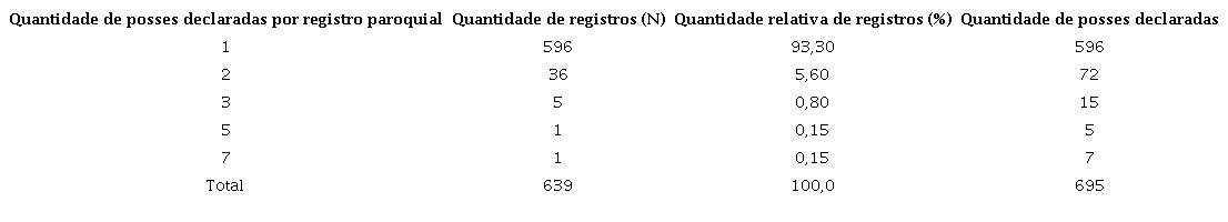 Na tabela 1 apresentamos a quantidade de posses declaradas em cada registro paroquial. Alguns assentamentos apresentam mais de uma posse, como se pode verificar a seguir.