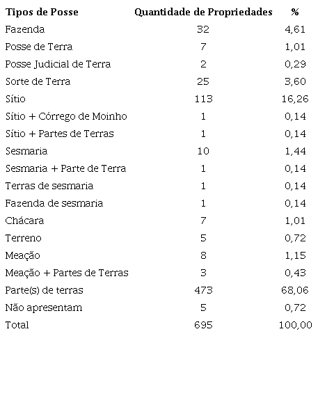 As informações sobre os tipos de posse de terra apresentam uma diversidade de referências às quais não dizem respeito apenas às formas de acesso, como por exemplo, sesmaria, data de terras, mas também às formas de uso tais como chácara, sítio, terreno, etc.
