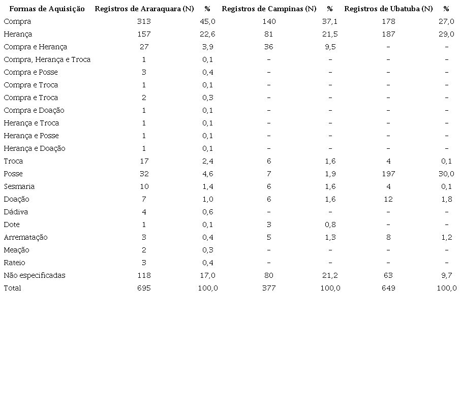 A grande maioria das declarações presentes nos Registros Paroquiais de Terras de Araraquara, 45%, vinculam-se à forma relacionada à compra e venda. Em Campinas esse segmento atinge um patamar de 37%, e em Ubatuba, 27%. Warren Dean (1977) não indica percentuais de compra para o Rio Claro, no entanto, afirma que 20% das declarações tiveram origem na herança ou doação, e 1/3 na posse. Tal percentual indicador da forma de acesso à terra por meio do mecanismo de posse, apenas se assemelha ao caso de Ubatuba, e se distancia muito do caso de Campinas, com 1,9% e Araraquara, com 4,6%. Vale destacar a observação de que Campinas estava atravessando uma conjuntura econômica de crescimento da agro exportação e de diferenciação da estrutura social (COSTA, 2004). Contudo, nota-se que a região mais dinâmica no tocante ao mercado de terras estava em Araraquara quando comparada à de Campinas e Ubatuba. Em estudo clássico, Petrone (1968) aponta que a grande maioria das terras declaradas foram transferidas pelo mecanismo de compra nas regiões de Itu, Jundiaí e Piracicaba.